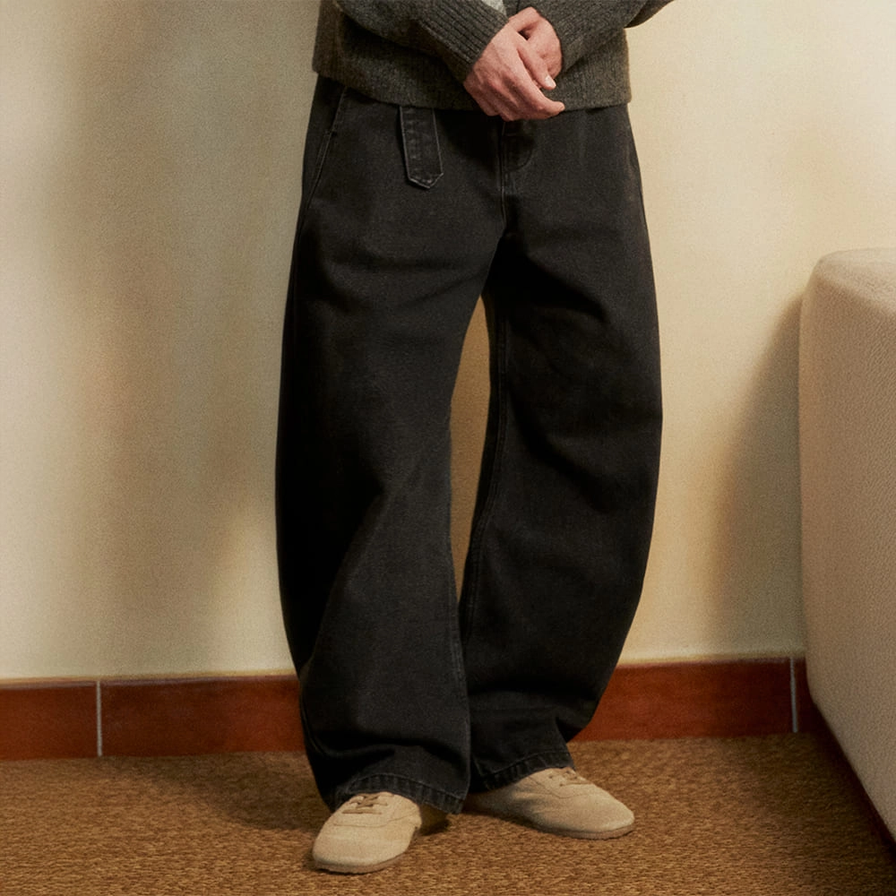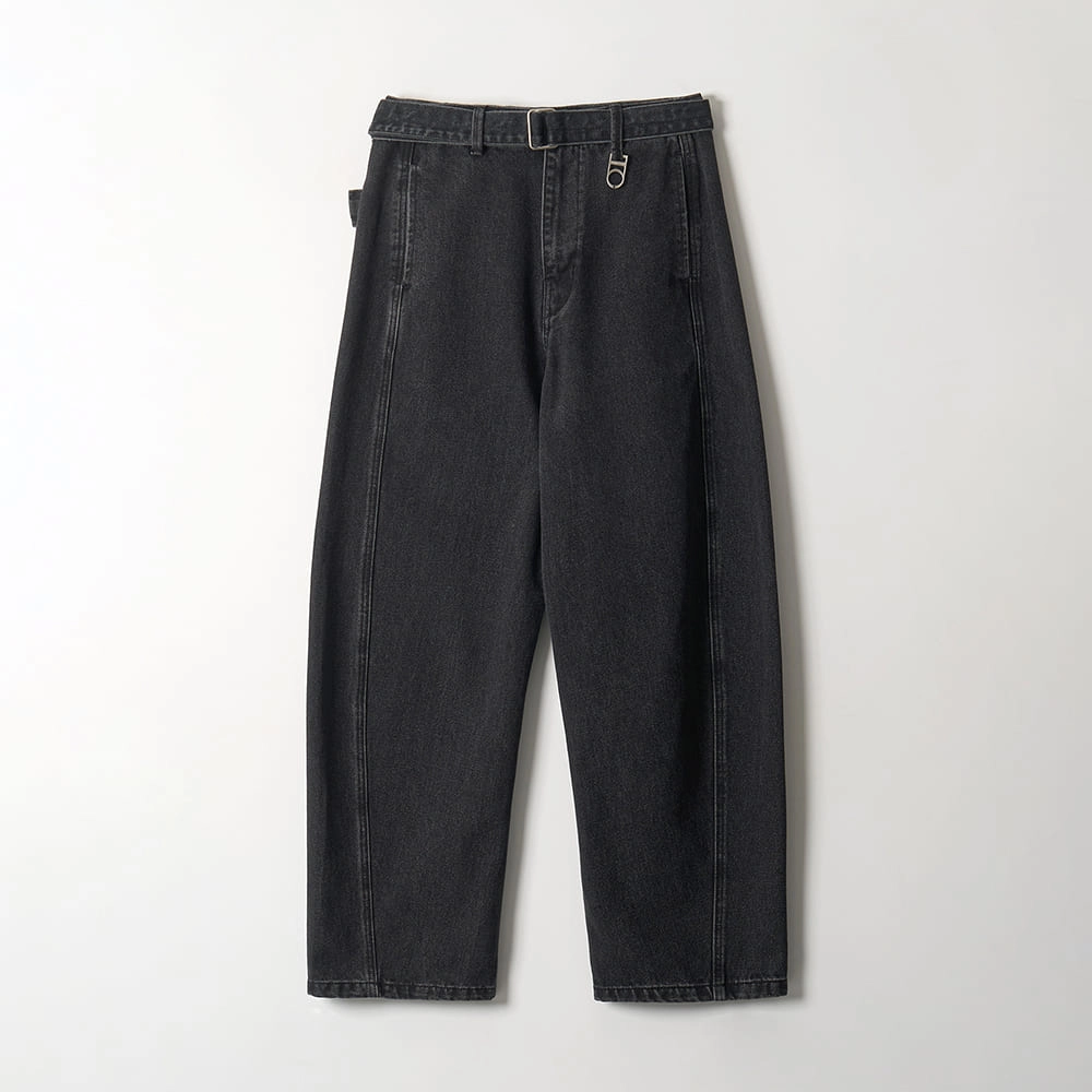 Belted Wide-Curved Denim Pants (WASHED BLACK)