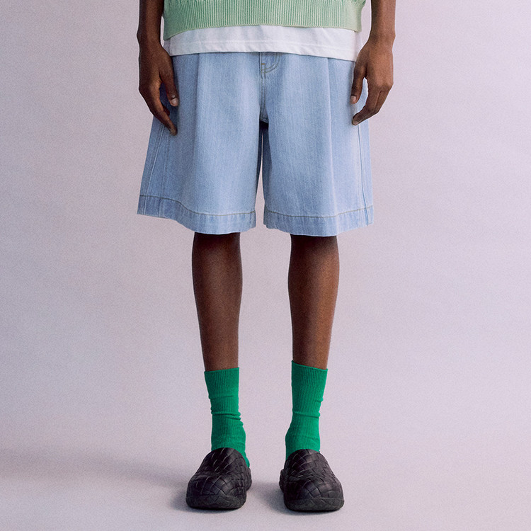 Denim Bermuda Pleated Pants (LIGHT INDIGO)