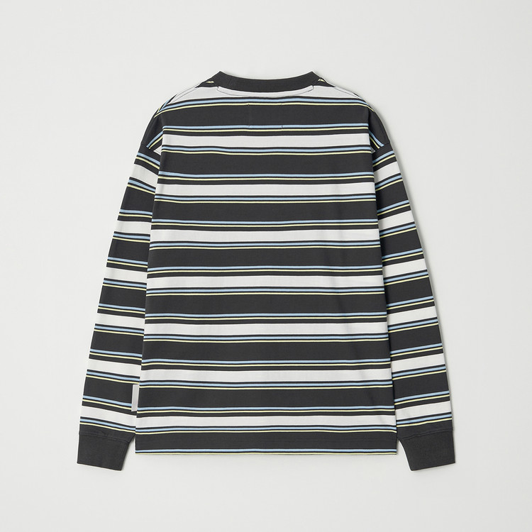 감각적인 컬러 배색의 멀티 스트라이프 패턴이 돋보이는 긴팔 티셔츠입니다.